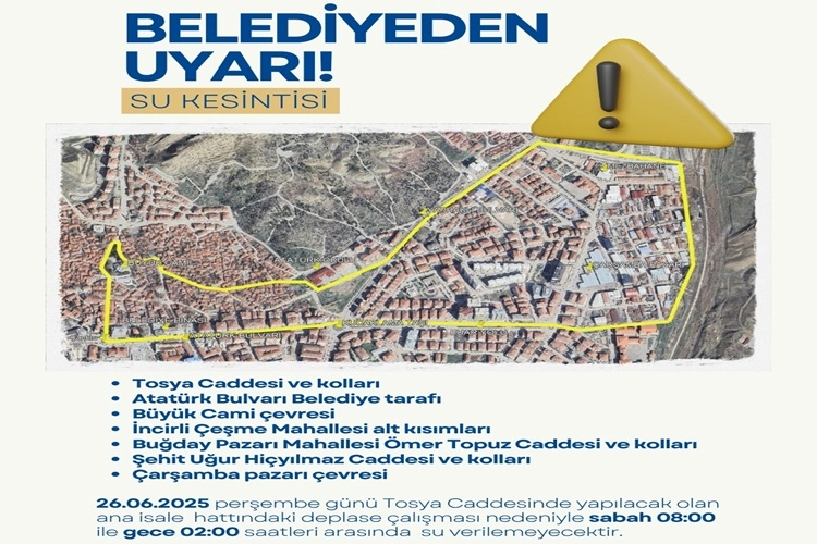 26 Haziran 2025 Perşembe günü de, Tosya Caddesi’nde yapılacak olan ana isale hattı deplase çalışması nedeniyle, aşağıda belirtilen bölgelerde sabah 08.00 ile gece 02.00 saatleri arasında su verilemeyecektir: