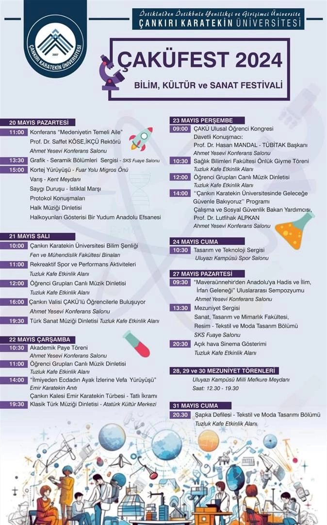 Çankırı Karatekin Üniversitesinde ÇAKÜFEST 2024 Bilim, Kültür ve Sanat Şenliği heyecanı başlıyor. 20 Mayıs-31 Mayıs tarihleri arasında pek çok etkinliğe sahne olacak ÇAKÜFEST 2024; konferans, sempozyum, kutlama törenleri, bilimsel etkinlikler, sergi, müzik, sinema, defile, halk dansları, spor ve kortej yürüyüşü gibi bilim, kültür ve sanatın birçok alanında bayram havasında geçecek.