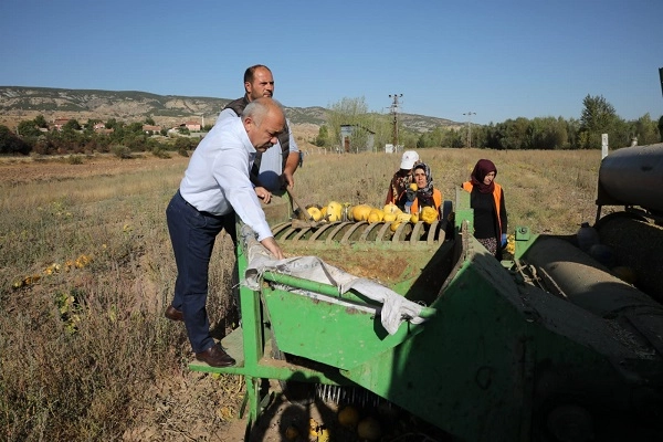 Belediyecilik hizmetlerinde kullanılan birçok ürünü kendi atölyelerinde üreten Çankırı Belediyesi üretmeye doymuyor. Kent mobilyalarından organik oyuncak üretimine, yöresel ürünlerin tescilinden satışına, ata tohumlarının toplanmasından atıl arazilerin tarım arazilerine dönüştürülmesine kadar birçok alanda Çankırı’nın üretim yelpazesini genişleten Belediye Başkanı Başkan İsmail Hakkı Esen, buğday ve ayçiçek hasadının ardından yemişlik kabak hasadını gerçekleştirdi. [caption id="attachment_20024" align="alignnone" width="600"]