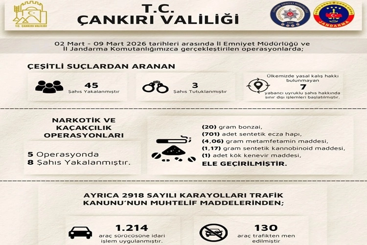 Çankırı Valiliği, il genelinde güvenlik güçleri tarafından yürütülen haftalık denetim ve operasyonlara ilişkin verileri kamuoyuyla paylaştı. Açıklamaya göre, 02 Mart 2026 – 09 Mart 2026 tarihleri arasında İl Emniyet Müdürlüğü ile İl Jandarma Komutanlığı ekiplerinin koordineli çalışmaları sonucunda çok sayıda kişi hakkında işlem yapıldı.