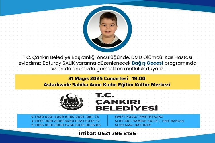 Çankırı Belediyesi, ölümcül kas hastalığı DMD (Duchenne Musküler Distrofi) ile mücadele eden minik Baturay Salık için anlamlı bir bağış gecesi düzenliyor.???? Tarih: 31 Mayıs 2025 Cumartesi???? Saat: 19.00???? Yer: Astarlızade Sabiha Anne Kadın Eğitim Kültür Merkezi