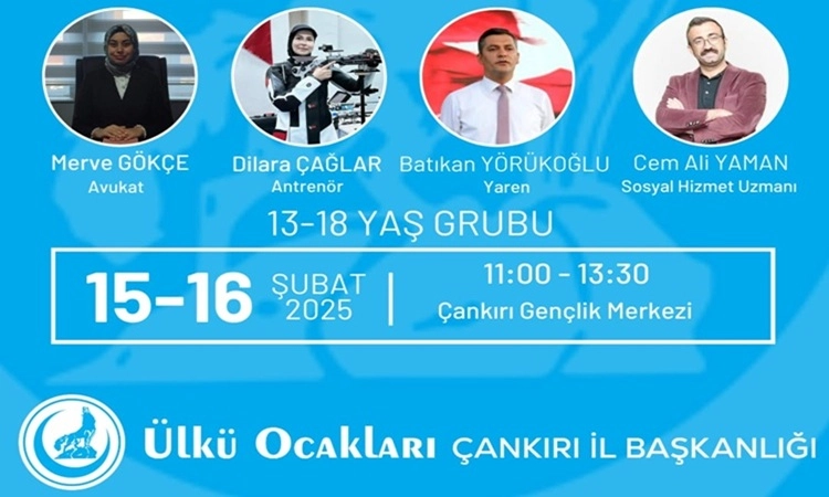 Ülkü Ocakları Çankırı İl Başkanlığı “Bilgiyi Güce, Gücü Geleceğe” temasıyla Gençlik Buluşması düzenliyor. Gençlere yönelik faaliyetleri ile vatandaşlardan olumlu tepkiler alan Ülkü Ocakları Çankırı İl Başkanlığı bu sefer de Gençlik Buluşmaları etkinliği ile gençlerle bir araya gelmeyi hedefliyor. 15-16 Şubat (Cumartesi-Pazar) tarihlerinde Çankırı Gençlik Merkezi’nde düzenlenecek etkinlikte hukuktan spora, yaren kültüründen duygusal zekâya birçok konuda alanında uzman konuklar tarafından gençlerimizle sohbet edilecek. 13-18 yaş aralığındaki gençlerimize yönelik düzenlenecek etkinlik, 11.00 – 13.30 saatleri arasında gerçekleştirilecektir. Programa katılım ücretsizdir.