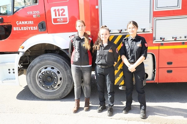 Kadın İtfaiyeciler Erkek Meslektaşları ile Omuz Omuza Mücadele Ediyor Çankırı’da aynı okulda Sivil Savunma ve İtfaiyecilik bölümünü okuyan üç kız arkadaş, Çankırı Belediyesinde meslektaş oldu. Çankırı Belediyesi İtfaiye Müdürlüğünün üç kadın itfaiye eri, komuta merkezine gelen ihbarları cevaplıyor, tatbikatlara katılıyor ve diğer itfaiye erleri ile birlikte Çankırı halkının canını ve malını kurtarmak için omuz omuza mücadele ediyor.