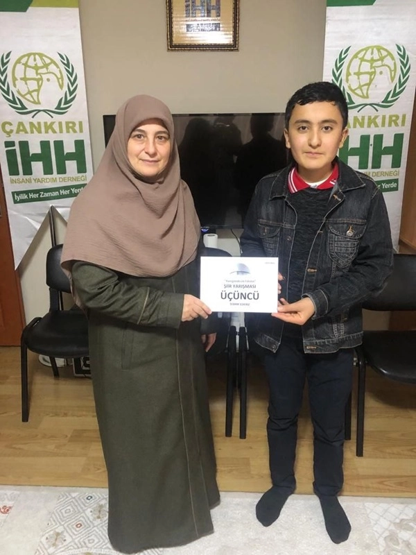 Kendi küçük fakat vicdanı ve yüreği büyük Muhammed Ali şiir yarışmasında kazandığı ödülü ÇANKIRI İHH aracılığıyla Gazze’ye bağışladı. 2 aydır Gazze’de yaşanan Siyonist soykırıma dikkat çekmek amacıyla Çankırı'da ortaokul ve liseler arasında düzenlenen "Yüreğimdesin Filistin" konulu resim, şiir ve kompozisyon yarışmasında Ortaokullar arası şiir yarışmasında üçüncü olan ve bin lira ödül kazanan 30 Ağustos İmam Hatip Ortaokulu öğrencisi Muhammed Ali Dinlemez büyük bir duyarlılık göstererek , Öğretmeni Ahmet Karakuş ile Çankırı İHH’ ya gelerek kazandığı ödülün tamamı olan bin lirayı Gazze’ ye gönderilmek üzere Çankırı İHH kadın Birimi Başkanımız Gülcan Kale’ye makbuz karşılığı teslim etti. Muhammed Ali ‘nin bu davranışı o sırada derneğimizde bulunan gönüllüleri duygulandırdı ve çevresinde büyük takdir topladı. Olay 18 Ailesi olarak, Muhammed Ali’yi bu onurlu davranışı, ailesini ve öğretmenlerini de Muhammed Ali’nin yetişmesindeki emekleri için tebrik ederiz.