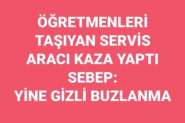 Yollardaki buzlanma, sürücülerin korkulu rüyası olmaya devam ediyor. Dünkü otobüs kazasından sonra bugün de öğretmenleri taşıyan servis aracı kazası haberi yürekleri ağızlara getirdi. Bugün sabah saatlerinde Çankırı'dan Karadayı köyüne öğretmenleri götüren servis aracı, gizli buzlanma nedeniyle sürücünün direksiyon hakimiyetini kaybetmesi sonucu kaza yaptı. Kaza sonrası, servis aracında bulunan 8 öğretmen ve 1 görevliye olay yerine çağırılan 112 Acil ekiplerince ilk müdahaleleri yapıldı. Ambulanslarla Çankırı Devlet Hastanesi'ne kaldırılan kazazedelerin yapılan tetkikler sonunda sağlık durumlarının iyi olduğu görüldü. Bunun üzerine tüm kazazedeler evlerine gönderildiler. Olay 18 ailesi olarak kazazedelere geçmiş olsun dileklerimizi iletiyor, yetkilileri bir daha bu tür kazalar yaşanmaması için bu yollarda önlem almaya davet ediyoruz.