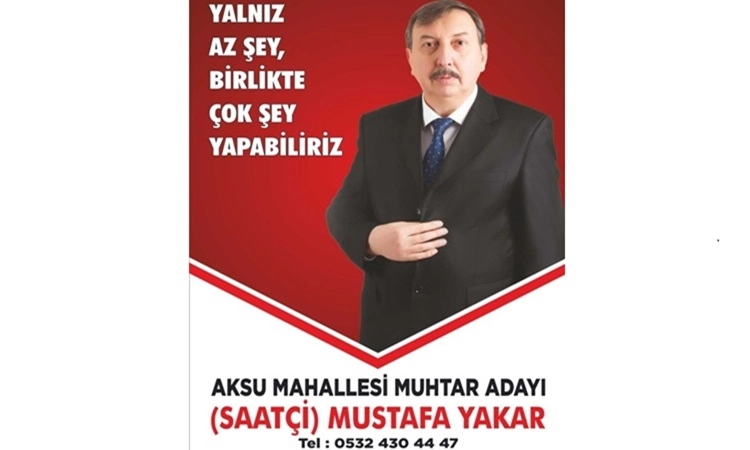 2004-2019 yılları arasında Aksu mahallesi Muhtarlığı görevini yürüten Mustafa Yakar, siz değerli Aksu Mahallesi sakinlerinden gelen yoğun talepleri kırmadı ve yeniden Aksu Mahallesi Muhtarlığı için aday oldu. Mustafa Yakar, 15 yıl süren Muhtarlığı boyunca Aksu Mahallesi'nde birçok hizmete imza attı. Adaylık açıklamasında, yeniden aday olmasındaki tek amacının