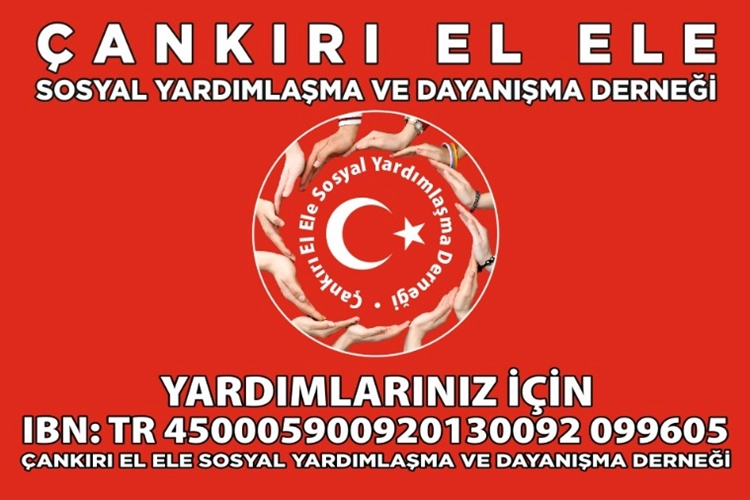 Yardım ve bağışlarınız için Dernek IBAN No: TR45000590092013099605 Çankırı El Ele Sosyal Yardımlaşma ve Dayanışma Derneği Adres: Mimar Sinan Mahallesi Pirinççiler Sokak No:7 Çankırı/Merkez