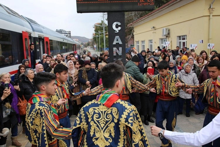 Yeni sezonun ilk günübirlik gezisine Ankara Garı’ndan hareket eden tren, üç saatlik yolculuğun ardından Çankırı Garı’na ulaştı. Ziyaretçiler, ilk duraklarında yaren ekibinin yöresel oyununa eşlik ederek eğlenmeye başladı.
