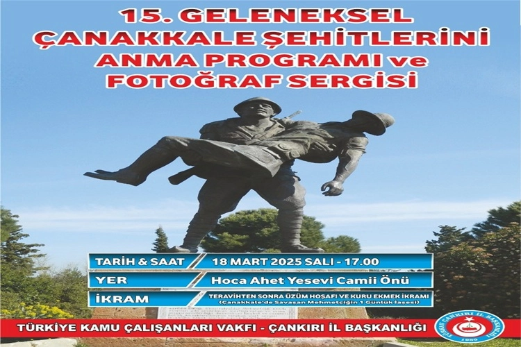 TÜRKAV Çankırı İl Başkanlığı olarak Kuru Ekmek ve Üzüm Hoşafı ile alınan ülke kaderine terk edilemez diyerek, onbeş sene önce başlattığımız ve geleneksel hale getirdiğimiz 15.Geleneksel Çanakkale Şehitlerini Anma Etkinliği bu yıl Hoca Ahmet Yesevi Camii önünde 18.03.2025 tarihinde Salı günü saat 17.00’de Fotoğraf sergisi ve Hatim duası yapılacak. Bu yıl Ramazan ayına gelmesi sebebiyle kuru ekmek ve üzüm hoşafı ikramı aynı gün 18.03.2025 Salı günü teravih namazından sonra Çanakkale cephesinde savaşan Mehmetçiğin bir günlük iaşesi olan kuru ekmek ve üzüm hoşafı ikramı yapılacaktır. Çanakkale’yi geçilmez kılan aziz şehitlerimiz nezdinde bu kutsal vatan topraklarını için seve seve canlarını vermiş. Türk milletini tarihten silmek isteyenlere karşı insanlık dersi vermiş aziz şehitlerimizi, gazilerimizi anmak için Hoca Ahmet Yesevi Camii önünde toplanıyoruz. Çankırı TÜRKAV olarak gerçekleştireceğimiz bu programa bütün Çankırılı hemşerilerimiz ve değerli basın mensuplarını bekleriz