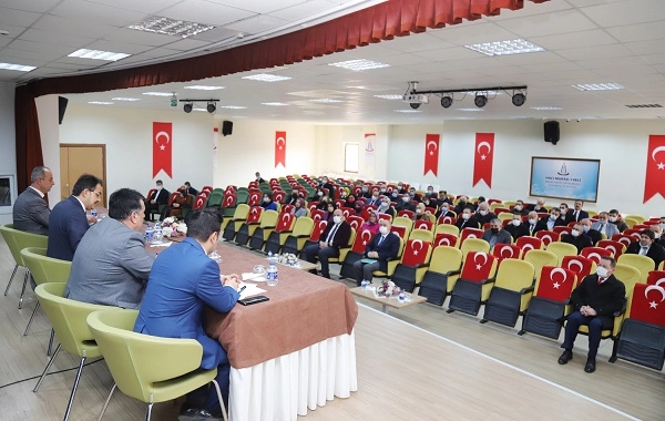 Vali Abdullah Ayaz, ilimizde bulunan yabancı uyruklu öğrencilerin eğitim gördüğü okulların müdürleriyle bir araya geldi. Hacı Murad-ı Veli İmam Hatip Ortaokulu Konferans Salonundaki toplantıya Vali Yardımcısı Şahin Bayhan, İl Milli Eğitim Müdürü Muammer Öztürk, İl Göç İdaresi Müdür Vekili Bekir Şahin Almaz, ilgili diğer daire amirleri ve okul müdürleri katıldı. Toplantıda müdürlere hitap eden Vali Ayaz, “Göç dün vardı, bugün var, yarın da olacak. Göç edenlerin sayıları artar veya azalır bunu bilemeyiz ama göç her zaman olacak. Göç konusunda önemli olan şey uyum. Bu uyum sürecinde önemli olan unsur da çocuklar. Göç edenler geri dönecek olsa da olmasa da bu çocukların eğitimlerinden geri kalmaması lazım. Geri dönen aileler için, burada eğitim alan çocuklar iyi bir eğitim alırlarsa bizim için birer gönül elçisi olacaklar, dönmezlerse de bu toplumda bir birey olarak yaşayacaklar. Bizim bu çocukların eğitim sürecini eksiksiz ve sağlıklı olarak sürdürmemiz gerekiyor.” dedi. Yabancı uyruklularla ilgili her türlü tedbiri almaya gayret ettiklerini açıklayan Vali Abdullah Ayaz, bu öğrencilerin eğitimlerine özel önem verdiklerini ifade etti. Vali Ayaz’ın konuşmasından sonra okullardaki yabancı uyruklu öğrencilerle ilgili konular görüşülerek problemleri çözme ve sorunları giderme odaklı çalışmaların yapılması hakkında istişarelerde bulunuldu.