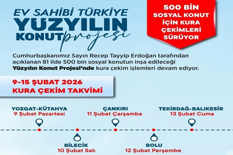 Cumhurbaşkanı Recep Tayyip Erdoğan tarafından kamuoyuna duyurulan ve 81 ili kapsayan 500 bin sosyal konutluk Yüzyılın Konut Projesi kapsamında Çankırı’da önemli bir aşamaya geçiliyor. Proje çerçevesinde Çankırı’da hak sahiplerini belirleyecek kura çekilişi, 11 Şubat Çarşamba günü gerçekleştirilecek.