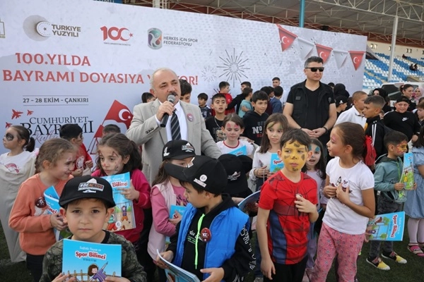 Çankırı Belediye Başkanı İsmail Hakkı Esen, 100. yıl etkinlikleri kapsamında Atatürk Stadı’nda düzenlenen “100. Yılda Çocuklarımız Bayramı Doyasıya Yaşıyor” programında çocuklar ile bir araya geldi. Çankırı’da bayram coşkusu, çocuk cıvıltıları ile daha da yükseldi. Birçok çocuk oyununa ev sahipliği yapan Atatürk Stadı, bayram coşkusu ile doldu taştı. Cumhuriyetin 100. Yıl kutlamaları kapsamında aileleri ile birlikte stada gelen çocuklar, birbirinden farklı çocuk oyunlarını akranları ile birlikte oynama fırsatı buldu. Çocukların bayram sevincine ortak olan Başkan Esen, yaptığı konuşmada Cumhuriyet’in gelecek olduğuna vurgu yaparak geleceğin teminatı çocuklara daha güzel ve yaşam standartı yüksek bir kent bırakma gayretinde olduklarını söyledi. Renkli görüntülere sahne olan etkinlikte çocuk oyunlarına eşlik eden Esen, çocuklarla bol bol fotoğraf çektirdi.