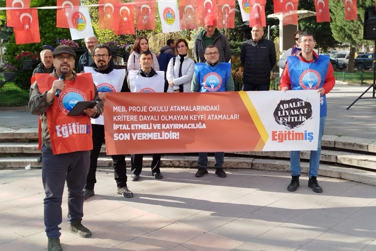 Eğitim ve Bilim İşgörenleri Sendikası (Eğitim-İş), yurt genelinde Milli Eğitim Bakanlığı'nın (MEB) Proje Okulu atamalarındaki kritere dayalı olmayan keyfi atamalarını bir basın açıklamasıyla protesto etti. Çankırı'da Eğitim-İş Çankırı Başkanı Murat Şamasas tarafından yapılan basın açıklamasında MEB, "Okulları, öğretmen ve öğrencileri proje, nitelikli, niteliksiz adıyla ayırmaktan derhal vazgeçin!" sözleriyle sert şekilde uyarıldı. Şamasas, "Okulların sahibi değilsiniz, buralar sizin şirketleriniz değil, eğitimde eşitliği, adaleti, hakkı ve liyakati öncelemek, sağlamak MEB’in asli görevidir." sözleriyle öğretmenlerin yaşadığı zorluk ve sıkıntıları dile getirdiği açıklamaya şöyle devam etti: "Proje okulları MEB’in istediğini atama projesidir, keyfiliğin, kayırmanın adresi haline geldiğini herkes biliyor! Milli Eğitim Bakanlığı, eğitimdeki sorunları çözmek yerine bilinçli olarak yeni sorunlar yaratmaya devam etmektedir. Atamaya dair objektif hiçbir kriteri bulunmayan proje okulları, siyasetin ve yandaş sendikaların keyfi şekilde makam, koltuk dağıtmak için kullandığı bir garabete dönüşmüştür. Bu okullara yapılan son atamalar MEB’in kayırmacılığını ve keyfiliğini bir kez daha gözler önüne sermiştir. Proje okullarındaki binlerce öğretmenin görev süresinin neden uzatılmadığına, yeni atamaların hangi ölçütlere göre yapıldığına dair somut hiçbir kanıt bulunmamaktadır. Görünen o ki okullarımızı protokollerle cemaat ve tarikatlara teslim eden Milli Eğitim Bakanlığı, kendini tüm okulların sahibi olarak görmekte liyakati, hakkı, hukuku yok saymakta adaletsizliğin odağı olmaktadır. MEB’in verilerine göre şu an 2153 okulun adı proje okulu, proje okullarında 79 bin 286 öğretmen, 5 bin 318 yönetici görev yapmakta, yaklaşık 500 bin öğretmen de proje okullarına atama için başvuru yapmaya uygun nitelikleri taşımaktadır. Bir proje okulunda 3 kadro varken, 4 kişinin başvurusu olmasına rağmen her nedense hiçbir atama yapılmamıştır! Neden? Kendinize uygun kişiyi bulamadınız mı? Çarpık sisteminiz mi yeteriz kaldı? Kıdemli birçok öğretmen, doktorası olan, yüksek lisansı olan, başarı ve üstün başarı belgeleri, maaşla ödüllendirilmesi olan, soruşturması, cezası olmayan, yıllardır aynı okulda görev yapan öğretmen atanmıyor. Neden? Ne olursa atanabilir, atanması için size tam olarak ne lazım, dürüst olun, buyurun açıklayın! Daha ne olması, ne yapması, ne tür başarıları göstermesi lazım öğretmenlerin? Eğitimdeki çağ dışı, bilim dışı, gerici politikalarınıza, aydın, başarılı eğitimcilerin hakkını yemenize, öğrencilerimizi ve eğitim çalışanlarını ayrıştırmanıza seyirci kalmayacağız. Hem örgütlü hem de hukuki olarak yaptığınız tüm haksızlıkların tüm kötülüklerin hesabını soracağız! Açtığımız ve kazandığımız birçok dava oldu, mahkemeler ne dedi? “Bakanlığın atama ve yer değiştirme yetkisi var ama bu yetkiler keyfi şekilde kullanılamaz”, “somut, objektif kriterler olmalı, atamaların mutlaka gerekçelendirilmesi gerekiyor” diyor. Cumhuriyet değerleriyle, laiklikle, halkın aydınlanmacı, ilerici öğretmenleriyle kavga eden bir iktidarın başarılı olması mümkün değildir. Nitelikli eğitim ancak kendini bu halkın çocuklarına adamış, idealist, Cumhuriyetçi öğretmenlerle sağlanır. Okullarımız eğitim yuvasıdır, liyakatı yok sayan, kayırmacılığa dayanan, okullarımızı tarikatların, cemaatlerin, yandaşların yuvası haline getirilemez. Eğitim-İş olarak hiçbir öğretmenimizin mağdur edilmesine, MEB’in öğretmen kıyımı yapmasına, kendisince makbul olmayan öğretmenleri niteliklerine bakmaksızın tasfiye etmesine izin vermeyeceğiz. Bu konuda mağdur olan, ataması yapılmayan her bir üyemizin hakkını sonuna kadar arayacak, tüm eğitim çalışanlarının haklı mücadelesinin yanında olacağız, her türlü yasal hakkımızı kullanacağız.