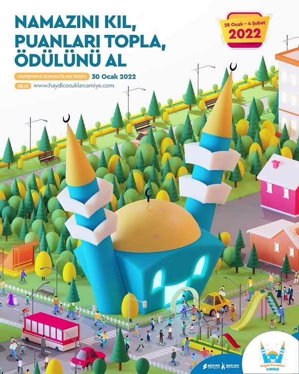 www.haydicocuklarcamiye.com sitesinden kayıt yapılıyor ve çocuklar namazlarını kıldıkça sistemden kendileri işaretliyor. Katılımcılara tam güven duyuyor ve kontrol mekanizmalarını kendi iç dünyalarına bırakıyoruz. Binlerce çocuğa proje sonunda çekilişle sürpriz hediyeler veriyoruz. Ayrıca önceden duyurusu yapılacak bazı vakitlerde camide cemaatle namazlarını kılanlar arasından çekilişle sürpriz hediyeler vereceğiz. Projeyi tanıtmak ve gönüllüsü olmak çok kolay; hedef kitlesine sahip akraba, komşu, iş arkadaşı, öğrenci vb. herkese duyuruyu ulaştırabilirsiniz. Ayrıca katılımcı çocuklar için hediye sponsoru olabilirsiniz. Kayıt Tarihi: 10-30 Ocak 2022 Yarışma Tarihi: 28 Ocak - 04 Şubat 2022 Katılım Yaşı: Yaş sınırı yoktur. Çekilişle ödül kazanma hakkı 6-13 yaş arasını kapsamaktadır. Kayıt ve Detaylı Bilgi:
