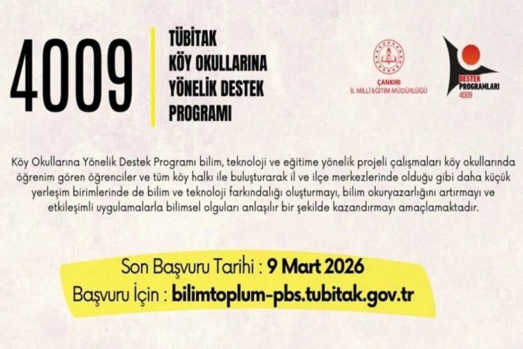 TÜBİTAK Bilim ve Toplum Başkanlığı tarafından yürütülen 4009 – Köy Okullarına Yönelik Destek Programı için 2026 yılı ilk çağrı dönemi resmen başladı. Program kapsamında, bilim ve teknoloji temelli proje çalışmalarının köy okullarında öğrenim gören öğrencilere ve köy halkına ulaştırılması hedefleniyor.