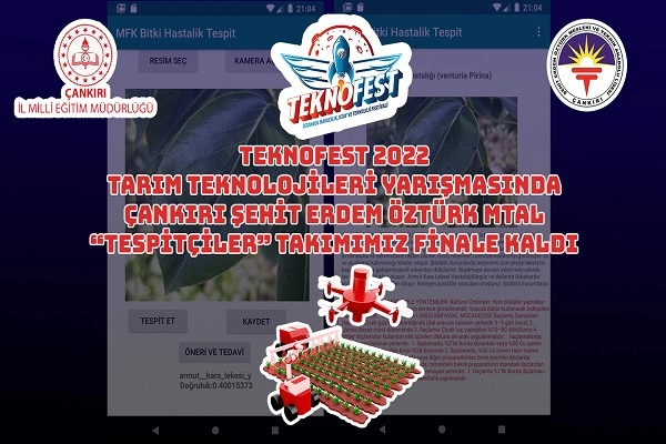 TEKNOFEST yarışmalarına katılan Çankırı Şehit Erdem Öztürk Mesleki ve Teknik Anadolu Lisesi Tarım Teknolojileri Yarışmasına “Meyve ve Sebze Bitki Yapraklar Görüntülerinden Hastalık Tespiti ve Tedavi Önerisi” projesi ile lise kategorisinde finallere katılmaya hak kazandı. Araçların görüntüleri üzerinden 4 özelliği aynı anda tespit edebilme özelliği olan bir yazılım geliştirmeyi hedefleyen Çankırı Şehit Erdem Öztürk MTAL Tespitçiler Takımı danışman öğretmenleri Bilişim Teknolojileri Alan Şefi Mehmet Furkan Kunduracı danışmanlığında hedeflerine ulaşmak istiyorlar. Ayrıca Mehmet Furkan Kunduracı’nın danışmanlık yaptığı diğer 3 proje de ön elemeyi geçmiş ve PDR sonuçlarının açıklanmasını bekliyor. Dünyanın en büyük havacılık festivallerinden olan TEKNOFEST, 30 Ağustos-04 Eylül tarihleri arasında Samsun Çarşamba Havalimanında gerçekleşecek. “Tarım Teknolojileri” finalinin 29-31 Temmuz tarihleri arasında Ordu’da yapılacağı bildirilen festivalde, Havacılık, Uzay ve Teknoloji alanında ilimizi temsil edecek Çankırı Şehit Erdem Öztürk MTAL öğrencilerimiz Nezahat Kübra Karaca, Şebnem Merve Arıkanoğlu ve Danışman Öğretmen Bilişim Teknolojileri Alan Şefi Mehmet Furkan Kunduracı’dan oluşan “Tespitçiler” takımımıza TEKNOFEST 2022 finallerinde başarılar dileriz.