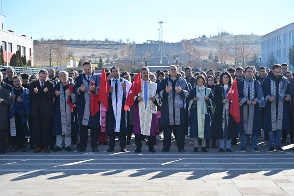 “VURULUP TERTEMİZ ALNINDAN UZANMIŞ YATIYOR, BİR HİLAL UĞRUNA YARAB NE GÜNEŞLER BATIYOR” Şehitlerimize rahmet, yakınlarına başsağlığı, gazilerimize acil şifa dileyerek başladığı konuşmasında, Rektörümüz Prof. Dr. Harun Çiftçi, “Millet olarak başımız sağ olsun. Çok üzgün ve çok öfkeliyiz! Bu milletin yiğit evlatları, vatan için bayrak için, bu vatanda hür ve bağımsız yaşayalım diye bizim için can veriyor. Milli şairimiz Mehmet Akif’in ifadesiyle ‘Vurulup tertemiz anlından uzanmış yatıyor, Bir hilal uğruna yarab ne güneşler batıyor’. Annelerin, evlatların, eşlerin feryatları arşa yükseliyor. Ocaklara ateş düşüyor, acılar dalga dalga büyüyor. Ancak hangi şehidimizin evine baksak gözler yaşlı olsa da başlar dik, duruşlarda vakar, bakışlarda gurur var. Eğer bugün vatanımızda güven içinde yaşıyorsak, bir başkasının ülkesinde sığınmacı değilsek, vatansız değilsek, mazlum milletlere umut, kimsesizlerin kimsesi bir Türkiye varsa bu, korkusuz kahramanlarımızın kar-kış demeden en zor şartlarda göğüs göğüse çarpışarak düşmana geçit vermemesi, dökülen mübarek kanları sayesindedir. Peygamber Ocağında yetişen bu Alpler, gayesi Allah rızası olan, şehitlik makamına çıkan bu yiğitlerimiz için gözyaşı döksek de boynumuzu bükmeyecek, bilakis onlarla gurur duyacağız. Emanetlerini sırtlayıp şehitlik yolunda yürüyen, Allah katında makamları yüce olanların kul katında da adlarını, şanlarını yücelteceğiz. Bize düşen bu vatanı şehitlerden emanet bilip gözümüz gibi korumaktır. Bu vatanı ayakta tutmak için toprağa düşenlerin eşlerini çocuklarını analarını babalarını emanet bilip onları baş tacı etmektir. Bize düşen budur! Çünkü, vatanı canından aziz bilenler canımızdan azizdir” diye konuştu.