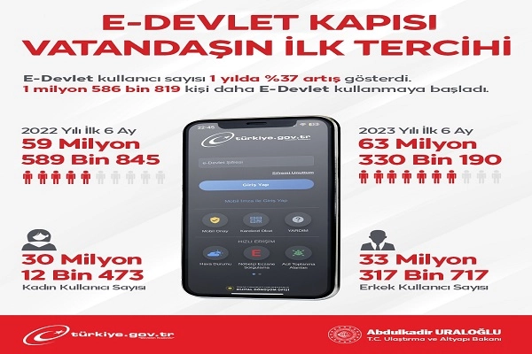 Ulaştırma ve Altyapı Bakanı Abdulkadir Uraloğlu, "E-Devletin önemi vatandaşlarımız için günden güne artıyor. Vatandaşlarımız kamu hizmetlerine erişimin kolaylaştığının farkında. 2023'ün ilk 6'ıncı ayında e-devlet kullanıcı sayısı 63 milyon 330 bin 190 kişiye yükseldi. Önceki yılın ilk altı ayında kullanıcı sayımız 59 milyon 589 bin 845 kişiydi. E-Devlet kullanan vatandaşlarımızın sayısında %37'lik büyük bir artış gerçekleşti. Kullanıcıların 30 milyonu kadın, 33 milyonu da erkek vatandaşlarımızdan oluşuyor" dedi.
