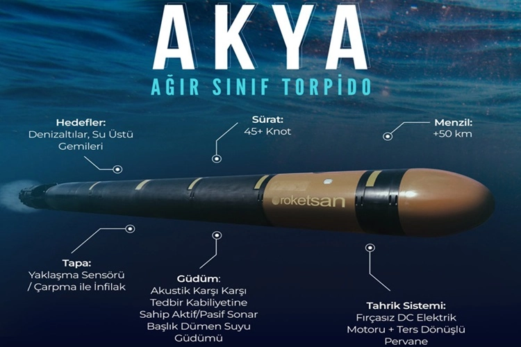 ROKETSAN’ın geliştirdiği yeni nesil ağır sınıf harp torpidosu AKYA, Türk Silahlı Kuvvetleri envanterinde ve Mavi Vatan’ın muhafızlarının hizmetinde. ROKETSAN’ın ürettiği su altı ve üstü hedeflere karşı kullanmak üzere geliştirilen AKYA, yeni nesil ağır sınıf torpido Türk Silahlı Kuvvetleri’nin envanterine eklendi.