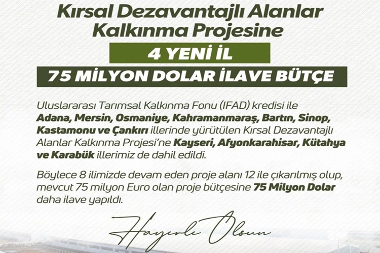 Açıklamada ayrıca, "Uluslararası Tarımsal Kalkınma Fonu (IFAD) kredisi ile Adana, Mersin, Osmaniye, Kahramanmaraş, Bartın, Sinop, Kastamonu ve Çankırı illerinde yürütülen Kırsal Dezavantajlı Alanlar Kalkınma Projesi'ne Kayseri, Afyonkarahisar, Kütahya ve Karabük illerimiz de dahil edildi. Böylece 8 ilimizde devam eden proje alanı 12 ile çıkarılmış olup, mevcut 75 milyon Euro olan proje bütçesine 75 Milyon Dolar daha ilave yapıldı." ifadeleri kullanıldı.