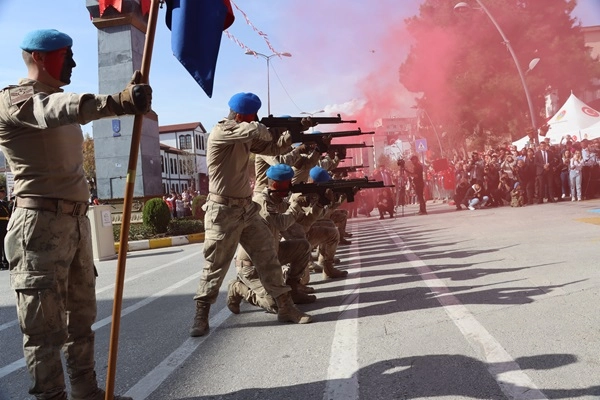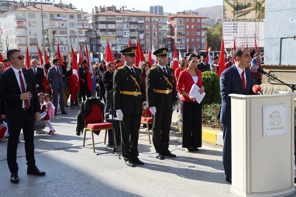 Program Vali M. Fırat Taşolar’ın beraberinde Garnizon Komutanı Tuğgeneral Salih Büyük ve Belediye Başkanı İsmail Hakkı Esen ile birlikte törene katılanların bayramını kutlamasıyla başladı. Saygı duruşu ve İstiklal Marşının ardından Cumhurbaşkanı Recep Tayyip Erdoğan'ın 29 Ekim Cumhuriyet Bayramı mesajı okundu. Günün anlam ve önemini belirten bir konuşma yapan Vali Taşolar, protokolü ve katılımcıları selamlayarak başladığı konuşmasında o günün büyük devletlerinden birinin ünlü bir başbakanının, “Kemal’in kurduğu Cumhuriyet, 10 yıl bile yaşayamaz” dediğini ancak Türk halkının önce 10. Yıl sonra da 50. Yıl Marşlarını yazdığını şimdi ise 100. Yıl Marşını yazdığını belirterek, "İnşallah bizim torunlarımız, 300. Yıl, 400. Yıl marşlarını da yazacaklar." dedi.