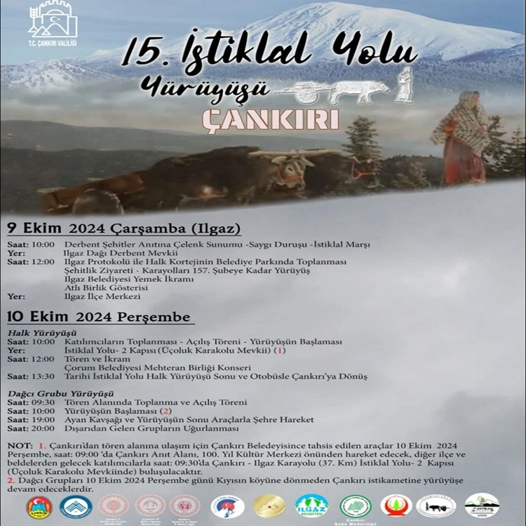 Bu anlamlı yürüyüşe Çankırı'dan katılmak isteyen vatandaşlar için Çankırı Belediyesi'nce tahsis edilen araçlar, 10 Ekim Perşembe günü saat 09:00'da Çankırı Anıt Alanı 100. Yıl Kültür Merkezi önünden hareket edecek olup, 100 yıl önce büyük fedakârlıklarla zafer kazanıp bugünleri yaşamamıza vesile olan ecdadımızı rahmet ve minnetle anmak ve geçmişimizi yad etmek amacıyla düzenlenen 15. İstiklal Yolu yürüyüşüne tüm halkımız davetlidir.