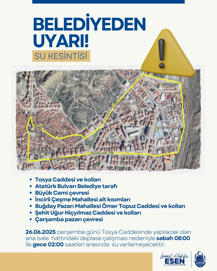 26 Haziran 2025 Perşembe günü de, Tosya Caddesi’nde yapılacak olan ana isale hattı deplase çalışması nedeniyle, aşağıda belirtilen bölgelerde sabah 08.00 ile gece 02.00 saatleri arasında su verilemeyecektir: