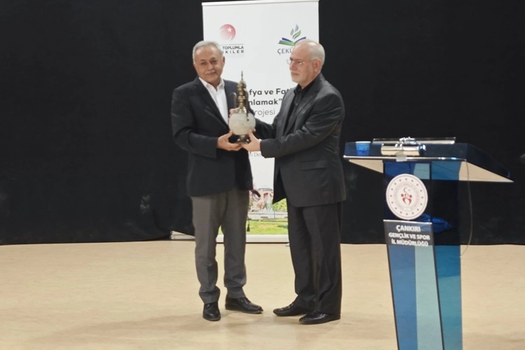 Konferans sonunda konuşmacı Necdet Yılmaz Bey'e Çankırı Çevre Kültür Derneği Başkanı Duran Karakoyun tarafından hediye takdimi yapıldı.