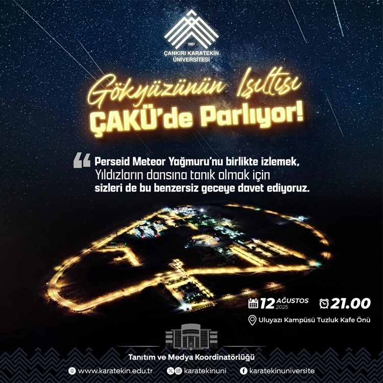 Çankırı Karatekin Üniversitesi (ÇAKÜ) Uluyazı Kampüsü, bu yazın en heyecan verici gökyüzü olaylarından biri olan Perseid Meteor Yağmuruna ev sahipliği yapmaya hazırlanıyor. 12 Ağustos 2025 Salı gecesi saat 21.00 ile 00.00 arasında gerçekleşecek olan etkinlik, gökyüzü tutkunlarını bir araya getirecek. Etkinlik, Uluyazı Kampüsü’nde Tuzluk Kafe önünde düzenlenecek.