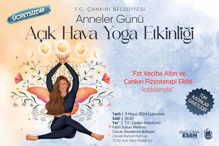 Çankırı Belediyesi, Fzt Veciha Altın ve Çankırı Fizyoterapi Ekibi katkılarıyla düzenlenen “Anneler Günü Açık Hava Yoga Etkinliği” düzenledi. 11 Mayıs Cumartesi günü saat 10.30’da Fatih Sultan Mehmet Çocuk Akademisi bahçesinde düzenlenecek etkinliğine katılacak kadınlar, uzmanlar eşliğinde matlar üzerinde yoga yapacak.