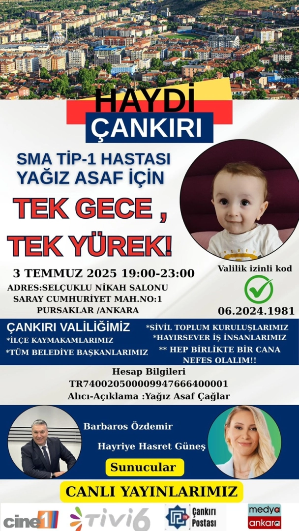 SMA Tip-1 hastalığı ile savaşan minik Yağız Asaf için kalpler bir araya geliyor. “Tek Gece, Tek Yürek” sloganıyla düzenlenen anlamlı yardım gecesi, 3 Temmuz 2025 Perşembe günü Ankara Pursaklar’daki Selçuklu Nikah Salonu’nda gerçekleştirilecek. Saat 19.00 ile 23.00 arasında düzenlenecek etkinlik, umut dolu bir yolculuğun en güçlü adımı olacak.