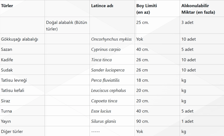 İç sularımızda amatör su ürünleri avcılığı yapacak vatandaşlarımız; aşağıdaki tabloda belirtilen boy limiti ve alıkonulabilir miktar kurallarına titizlikle uymaları gerekmektedir.