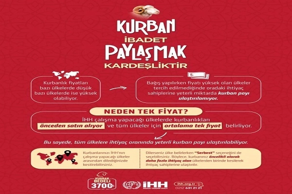 İHH’nın bu bayram belirlemiş olduğu kurban bedeli yurt içinde ve yurt dışında tek fiyat olarak 3700.-TL. Vekâlet yoluyla kurbanlarını İHH’ya bağışlamak isteyen hayırseverler, kurban çalışmaları için belirlenen Türkiye, Azerbaycan, Kırgızistan, Tacikistan, Kazakistan, Moğolistan, Gürcistan (Acara), Afganistan, Yemen, Filistin (Gazze ve Batı Şeria), Suriye, Irak, Lübnan, Ürdün, Çad, Mali, Benin, Togo, Nijer, Sierra Leone, Burkina Faso, Moritanya, Gine, Burundi, Etiyopya, Uganda, Malavi, Sudan, Somali, Tanzanya, Kenya, Cibuti, Bangladeş (Arakan), Myanmar (Arakan), Pakistan, Tayland (Patani), Nepal, Sri Lanka, Filipinler (Bangsamoro), Hindistan (Keşmir), Vietnam, Bosna Hersek, Kosova, Arnavutluk, Kuzey Makedonya, Karadağ, Sırbistan (Sancak ve Preşova), Romanya, Ukrayna (Kırım), arasında kotalar dahilinde dilediğinde kurbanını kestirip ihtiyaç sahiplerine ulaştıracak. Kurban bağışları, bayramın 2’nci günü (29 Haziran 2023 Perşembe) saat 23.59’a kadar yapılabilecektir.”
