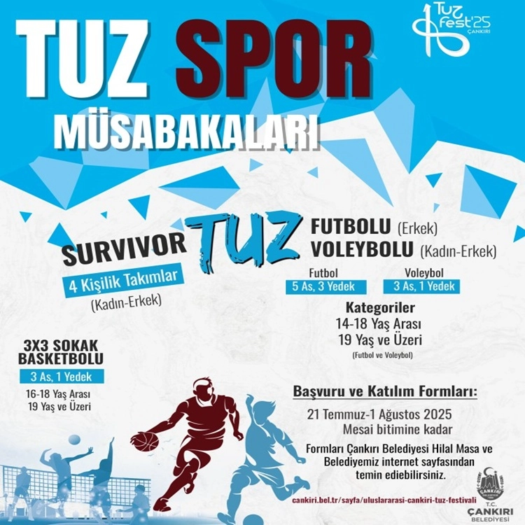 4. Uluslararası Çankırı Tuz Festivali’nin açılış etkinliği Tuz Müsabakaları için kayıtlar 21 Temmuz’da başlıyor. Futbol, Voleybol, 3x3 Sokak Basketbolu ve Tuzsurvivor kategorilerinde yarışmak isteyen gruplar, 21 Temmuz–1 Ağustos 2025 tarihleri arasında Belediye Hilal Masa veya Çankırı Belediyesi resmi internet sitesinden temin edecekleri formları doldurarak başvuru yapabilecek.