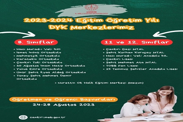 Çankırı İl Millî Eğitim Müdürlüğü Merkez İlçe DYK Komisyonu tarafından 2023-2024 eğitim öğretim yılı Destekleme ve Yetiştirme Kursları için il merkezimizde 9 Ortaokul, 7 Ortaöğretim ve 1 Halk Eğitimi Merkezi olmak üzere 17 kurum kurs merkezi olarak belirlenmiştir. 8. sınıf öğrencileri ortaokul, 11 ve 12. sınıf öğrencileri ortaöğretim (okul türleri dikkate alınarak) mezun durumunda olanlar ise Halk Eğitimi Merkezi Kurs Merkezleri'nden yararlanabileceklerdir.