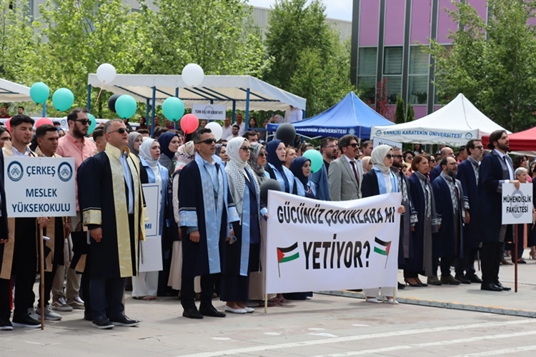 ÇAKÜ mezuniyet törenlerinde İsrail zulmü altındaki Filistinli kardeşlerimize destek pankartları dikkat çekti.
