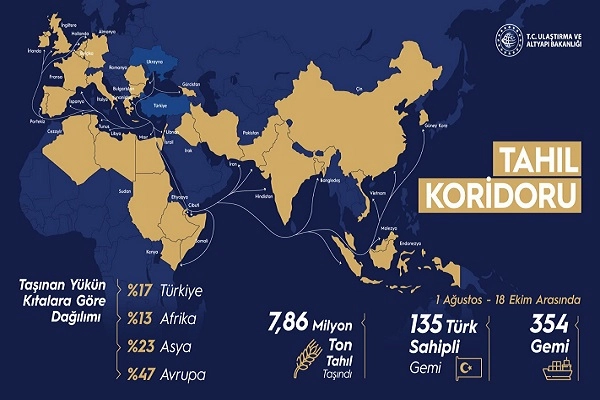 Ulaştırma ve Altyapı Bakanı Adil Karaismailoğlu, Tahıl Koridoru kapsamında 1 Ağustos - 18 Ekim tarihleri arasında 354 geminin Ukrayna limanlarından hareket ettiğini açıkladı ve "Bugüne kadar taşınan toplam yük miktarı 7 milyon 860 bin tonu aştı. Türkiye limanlarına gelen gemilerin taşıdığı toplam yük ise 1 milyon 294 bin 706 ton oldu. Toplam yükün yaklaşık yüzde 17'si Türkiye limanlarına geldi" dedi.