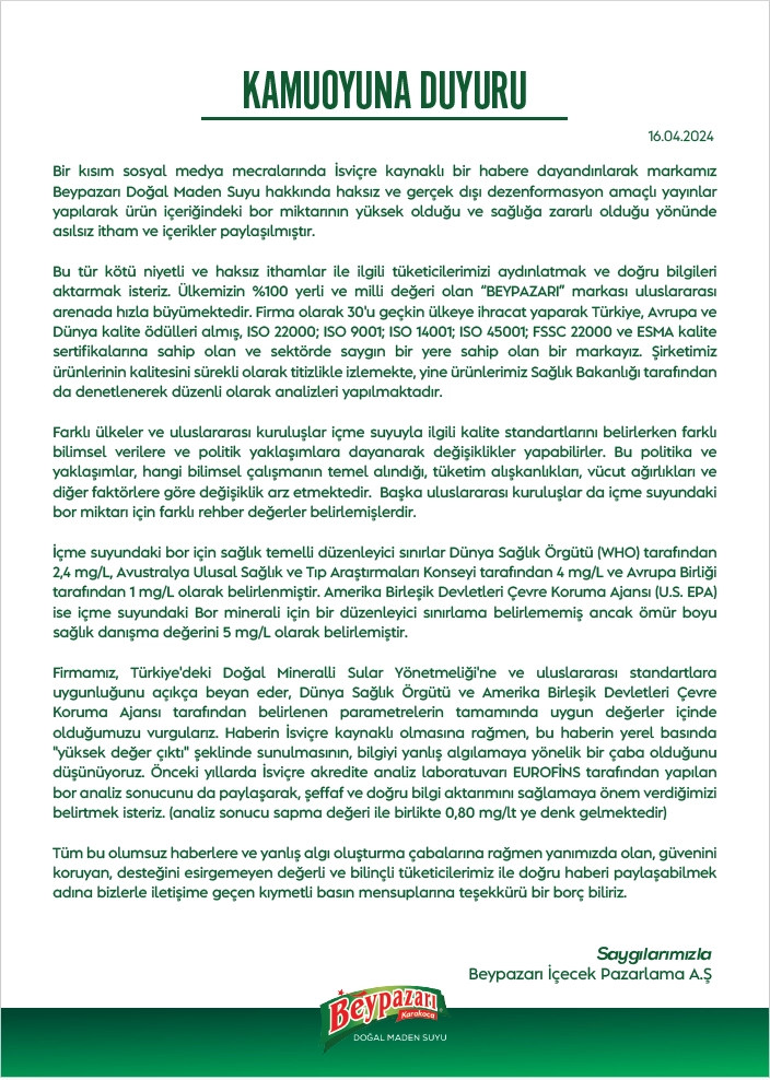 "Bir kısım sosyal medya mecralarında İsviçre kaynaklı bir habere dayandırılarak markamız Beypazarı Doğal Maden Suyu hakkında haksız ve gerçek dışı dezenformasyon amaçlı yayınlar yapılarak ürün içeriğindeki Bor miktarının yüksek olduğu ve sağlığa zararlı olduğu yönünde asılsız itham ve içerikler paylaşılmıştır. Bu tür kötü niyetli ve haksız ithamlar ile ilgili tüketicilerimizi aydınlatmak ve doğru bilgileri aktarmak isteriz.