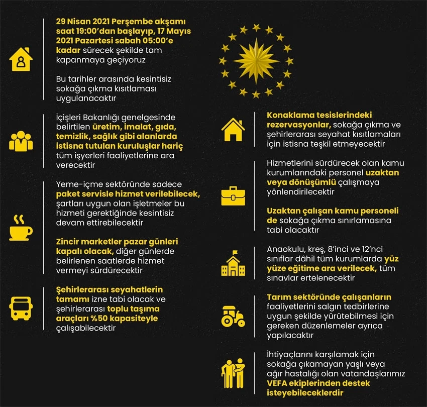 Cumhurbaşkanı Recep Tayyip Erdoğan, kabine toplantısının ardından yaptığı açıklamada "29 Nisan 2021 yani perşembe akşamı saat 19.00'dan başlayıp, 17 Mayıs 2021 Pazartesi gününe kadar sürecek tam kapanmaya geçiyoruz." dedi.