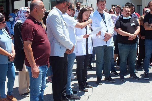 Bize kapı gösterilse de bizler şerefli beyaz önlüklerimizle, hekimlik mesleğinin onuru ve şerefi ile burada meslektaşımızın yasını tutuyoruz.