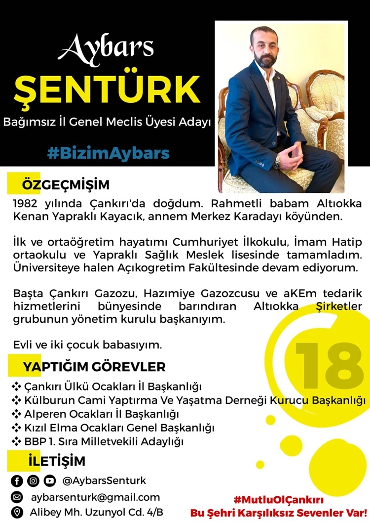 Çankırımızın sevilen yüzü Çankırılı iş insanı Aybars Şentürk, Bağımsız İl Genel Meclisi Üyesi adayı oldu. 1982 - Çankırı doğumlu olan Şentürk, Yapraklı Kayacık köyünden Altıokka lakaplı merhum Kenan Şentürk'ün oğlu.