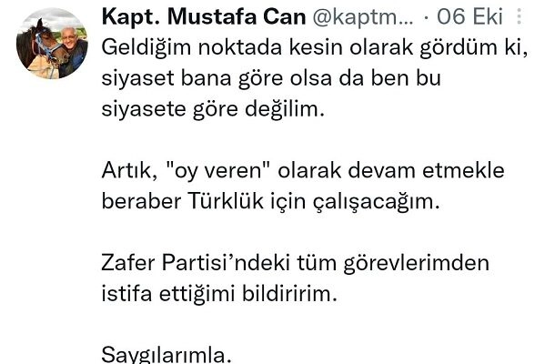 Zafer Partisi Genel Başkan Yardımcılığı görevini başarıyla yürüten Çankırılı hemşerimiz Kaptan Mustafa Can, 21 Ağustos 2022 günü yapılan seçimde oy birliği ile Zafer Partisi İstanbul İl Başkanlığı'na seçilerek bizleri bir kez daha gururlandırmıştı. Aradan geçen bir buçuk aylık süreçte neler değişti bilemiyoruz ama hemşerimiz Mustafa Can, geçtiğimiz günlerde sosyal medya hesaplarından yaptığı açıklama ile partisindeki tüm görevlerinden istifa ettiğini duyurdu.
