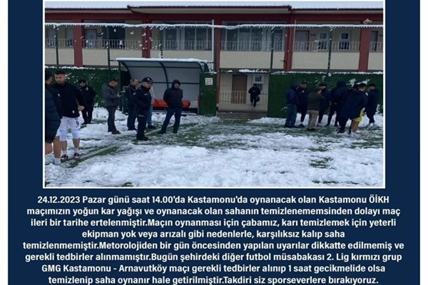 Bölgesel Amatör Lig 12. Grup'ta bugün oynanması gereken Çankırı Saray 18 Spor - Kastamonu Özel İdarespor maçı, kar yağışı nedeniyle ertelendi. Çankırı Saray 18 Spor'lu oyuncular tam kadro maçın başlayacağı anı beklerken sahadaki karın temizlenmemesi sonucu maç, hakem tarafından ertelendi. Ellerinde kar temizlemek için gerekli bütün makinaların bulunması gereken Özel İdare takımının kendi sahasındaki karı bile temizleyememesine bir anlam veremeyen Kulüp Başkanı Metin Kılıç, duruma isyan etti.
