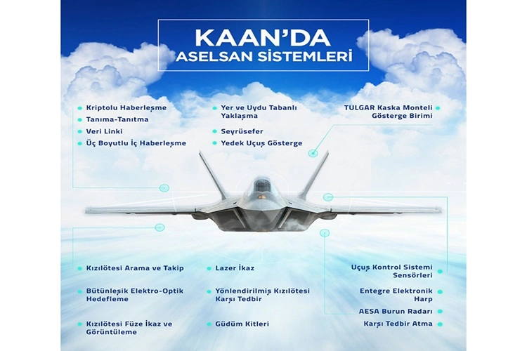 Bu kapsamda, şirketin kriptolu haberleşme, tanıma-tanıtma, veri linki, 3 boyutlu iç haberleşme, yer ve uydu tabanlı yaklaşma, seyrüsefer, yedek uçuş gösterge, TULGAR kaska monteli gösterge birimi, kızılötesi arama ve takip, bütünleşik elektro-optik hedefleme, kızılötesi füze ikaz ve görüntüleme, lazer ikaz, yönlendirilmiş kızılötesi karşı tedbir, güdümlü kitleri, uçuş kontrol sistemi sensörleri, entegre elektronik harp, AESA burun radarı, karşı tedbir atma gibi ASELSAN alt sistem ve ekipmanları KAAN’ın etkin şekilde görev yapmasına katkı sağlayacak.