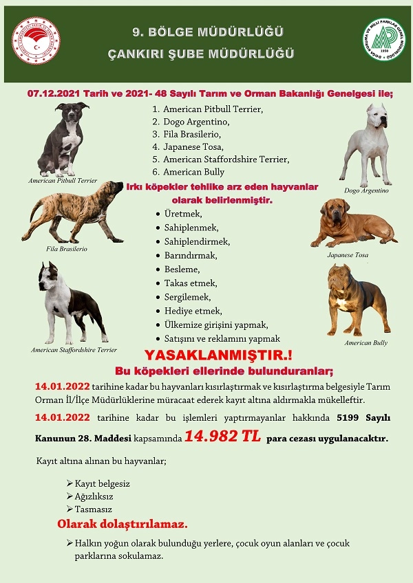 Bu minvalde, 5199 sayılı Kanunun yukarıda zikredilen 14 üncü maddesi hükmü uyarınca, Amerikan Pitbull Terrier, Dogo Argentino, Fila Brasilerio, Japanese Tosa, American Staffordshire Terrier ve American Bully ırkı köpekleri üretmek, sahiplenmek, sahiplendirmek, barındırmak, beslemek, takas etmek, sergilemek, hediye etmek ve bunların ülkemize girişini, satışını ve reklamını yapmak yasaklanmış olup bu hükme aykırı davrananlara 5199 sayılı Kanunun 28 inci maddesi kapsamında idari yaptırım uygulanacaktır.
